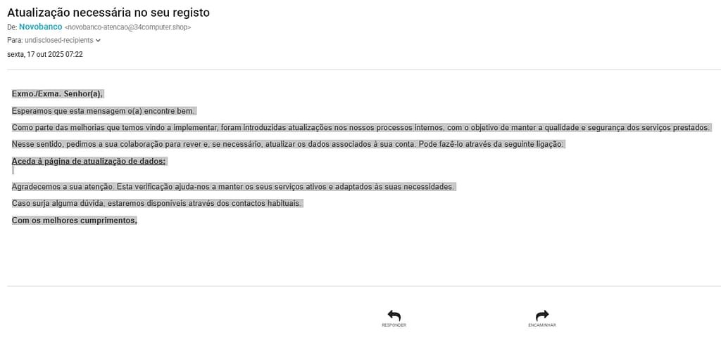 Nos últimos dias, vários utilizadores receberam um email fraudulento que tenta imitar o Novo Banco. À primeira vista, o texto parece legítimo: o português está correto, o tom é profissional e até fala em “melhorias de segurança”. No entanto, trata-se de uma tentativa de burla digital bem disfarçada.